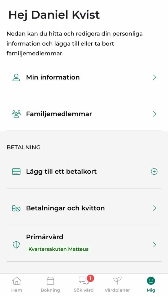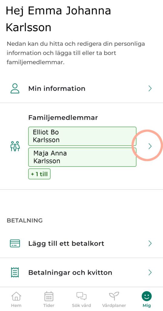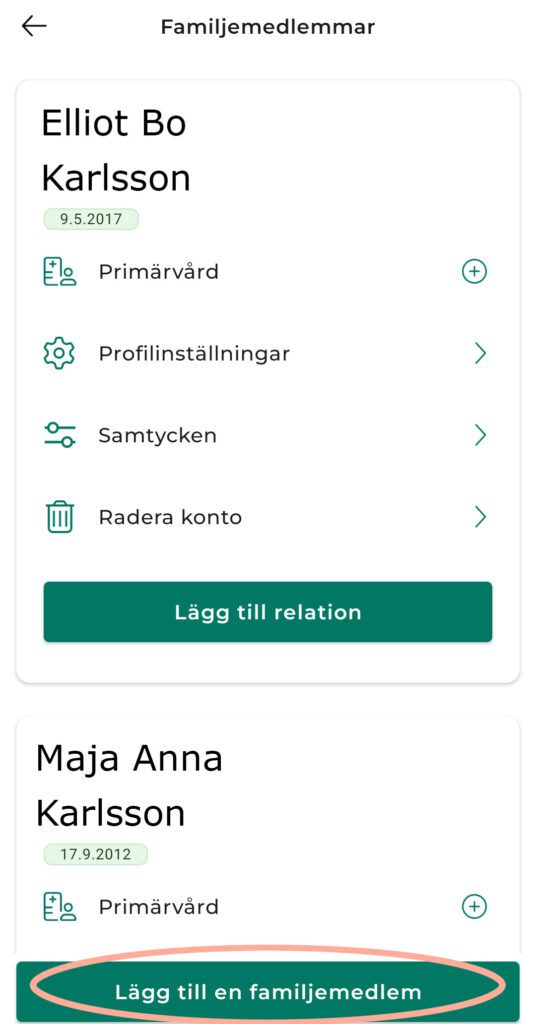 När personnumret är ifyllt kan du tryck på knappen “Lägg till familjemedlem” så läggs personen till och du kan se den på din profilsida. Du kan nu agera åt din familjemedlems vägnar, till exempel starta en chatt med läkare eller sjuksköterska för ditt barn.