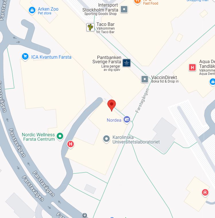 Du hittar oss på kortsidan av Läkarhuset Farsta, mitt i Farsta Centrum i södra Stockholm. Ingången hittar du bredvid Nordea banken. Anmäl dig i receptionen när du kommer in.